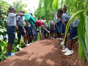 Au sein de 10 écoles des communes de Petit-Goâve et Grand-Goâve, des jardins pédagogiques ont été créés conjointement par l’APV, les enseignants, les élèves et les comités de gestion scolaire, selon la méthodologie Réflexion-Action-Formation (RAT). Cette approche participative a permis aux élèves de s’approprier pleinement le processus, de la planification à la mise en œuvre. Les écoles ont été dotées d’outils agricoles et d’une large gamme de semences adaptées au contexte local : bananiers, choux, aubergines, poireaux, poivrons, piments, carottes, canne à sucre, salades, et légumes-racines (malanga, taro). Une assistance technique continue fournie par l’APV a assuré l’adoption de bonnes pratiques agroécologiques, incluant la gestion durable des sols, la rotation des cultures, et l’utilisation de compost organique.