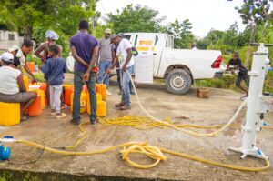 Face au risque immédiat de maladies hydriques causé par la destruction des réseaux d’adduction, on a traité près de 100 000 litres d’eau contaminée grâce à des unités de filtration portatives SkyHydrant. À Camp-Perrin, où le système d’eau avait subi de lourds dommages, des milliers d’habitants étaient privés d’accès sécurisé. Mario, président du CAEPA de Camp-Perrin, témoigne : « La situation est critique. Le système principal est hors service depuis l’ouragan. Sans appui, les familles n’ont plus d’eau. »