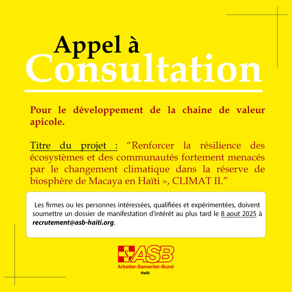 de manifestation d’intérêt au plus tard le 8 aout 2025 à l’adresse : recrutement@asb-haiti.org