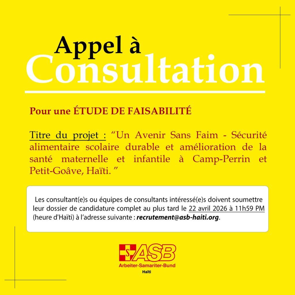 Processus d’application : Les consultant(e)s ou équipes de consultants intéressé(e)s doivent soumettre leur dossier de candidature complet au plus tard le 22 avril 2026 à 11h59 PM (heure d’Haïti) à l’adresse suivante : recrutement@asb-haiti.org